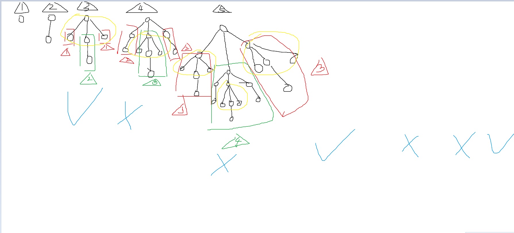 这个题目画图思考后当然是递归或者递推啦! 对于层数为n的树,根节点的三个子节点中,左右子树为n-2,中间子树为n-1; 所以初步递推为f(n)=f(n-1)+2*f(n-2); 这个代码写完后发现是错的,错在哪里呢?当根节点为3的倍数时候,根节点与其三个子节点可以染色形成一组claw。 递推的初值为: f[0]=f[1]=f[2]=0