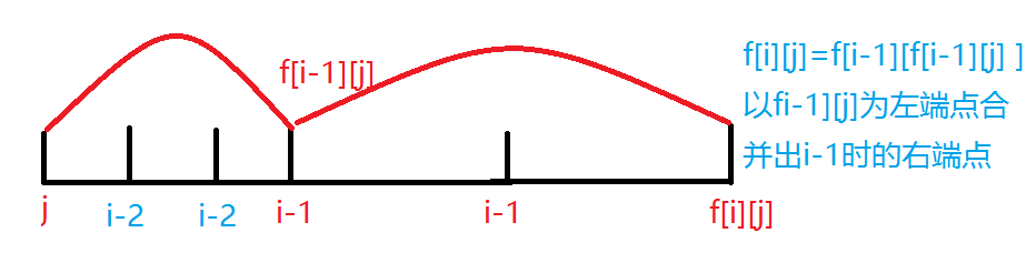 设 $f_{i,j}$ 为合并出 $i$ ,左端点为 $j$,右端点的位置。