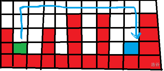 先考虑一般的步骤,就是先向上走,避开障碍(到达一个没有障碍存在的行),然后向右走,走到终点所在的列,然后向下走到终点。